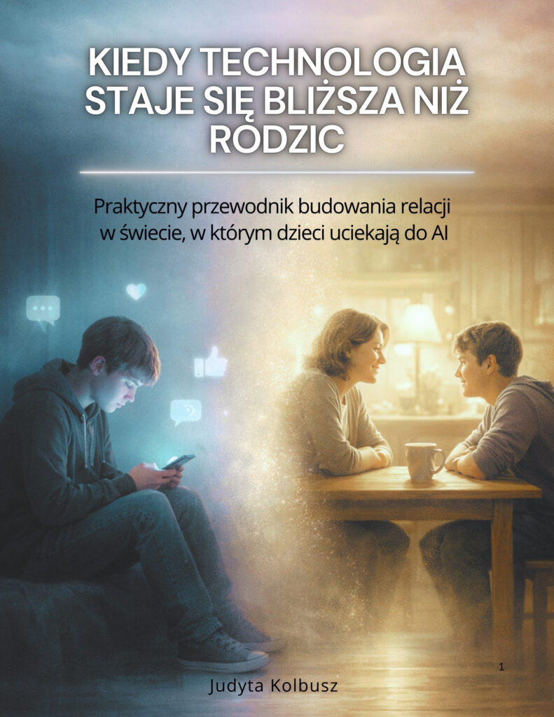 Praktyczny przewodnik budowania relacji w świecie, w którym dzieci uciekają do AI – 99 stron wiedzy i ćwiczeń.